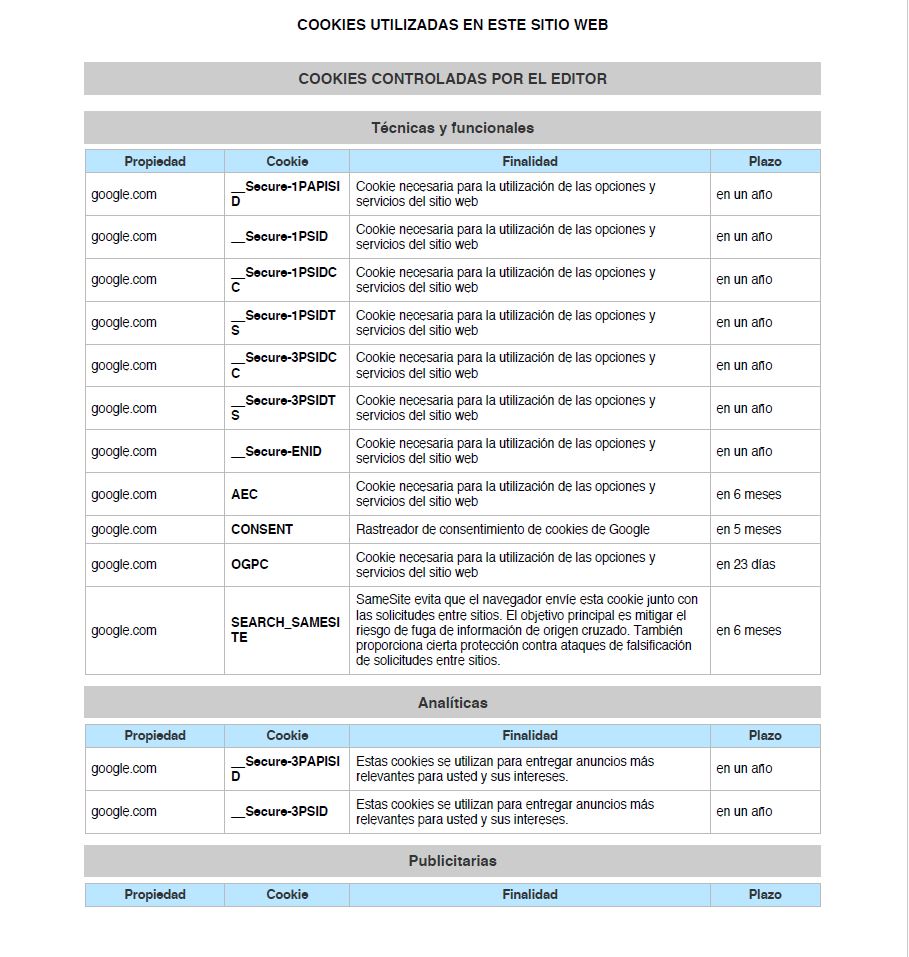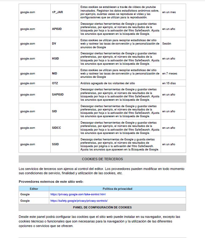 Conforme con la Ley 34/2002, de 11 de julio, de servicios de la sociedad de la información y de comercio electrónico (LSSI), en relación con el Reglamento (UE) 2016/679 del Parlamento Europeo y del Consejo, de 27 de abril de 2016, General de Protección de Datos (GDPR) y la Ley Orgánica 3/2018, de 5 de diciembre, de Protección de Datos y Garantía de los Derechos Digitales (LOPDGDD), es obligado obtener el consentimiento expreso del usuario de todas las páginas web que usan cookies prescindibles, antes de que este navegue por ellas.